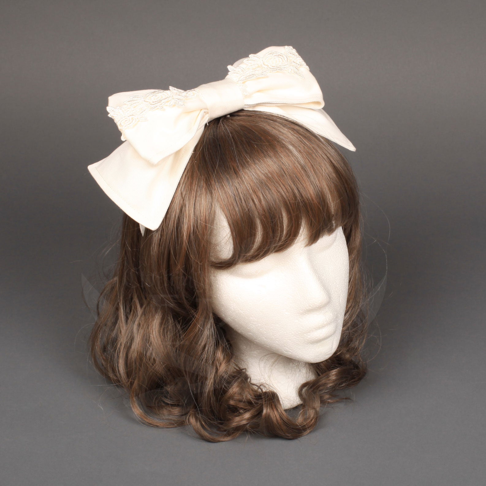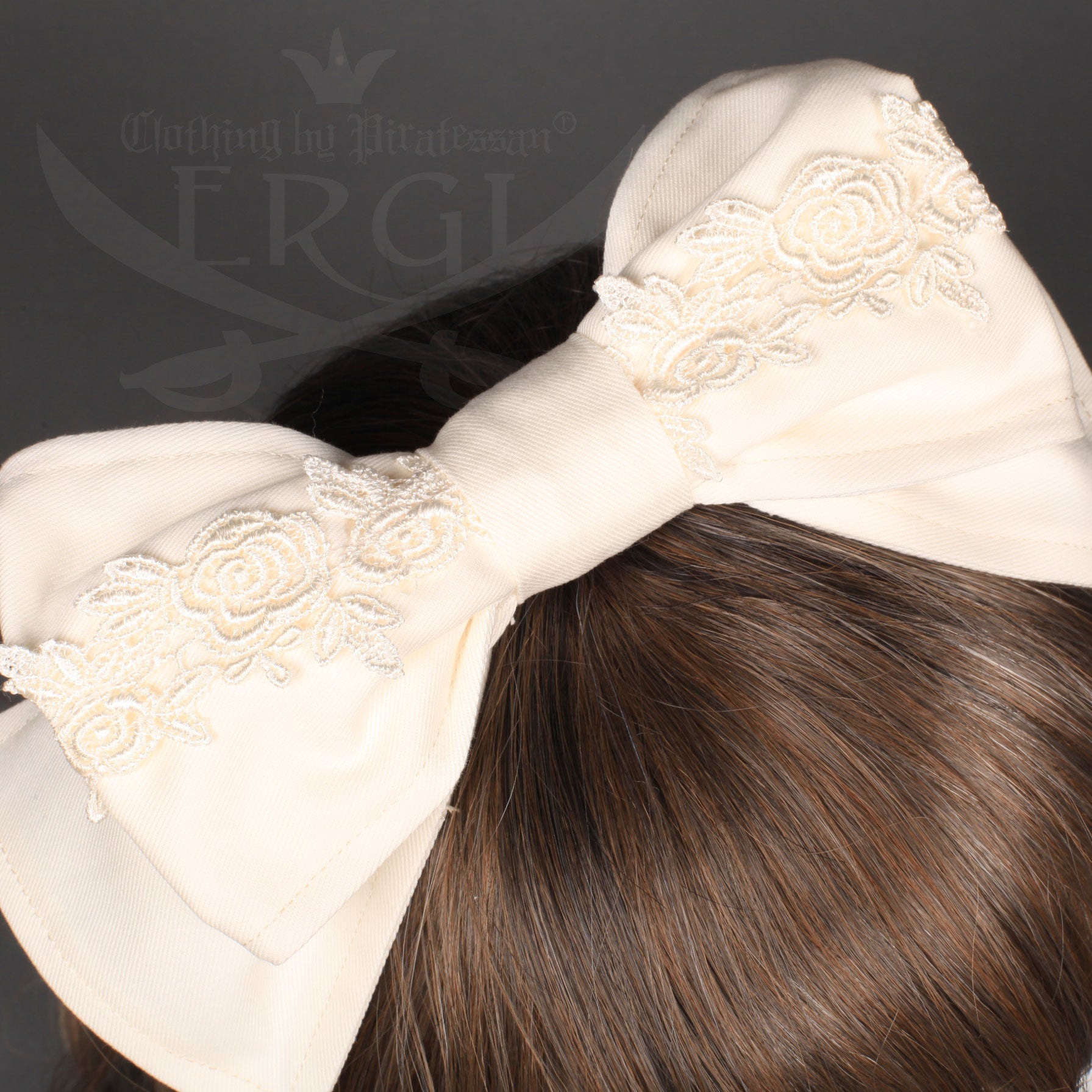 Twill bow with off white rose trim decoration. Top part of the bow is steel wired for shapely purposes.