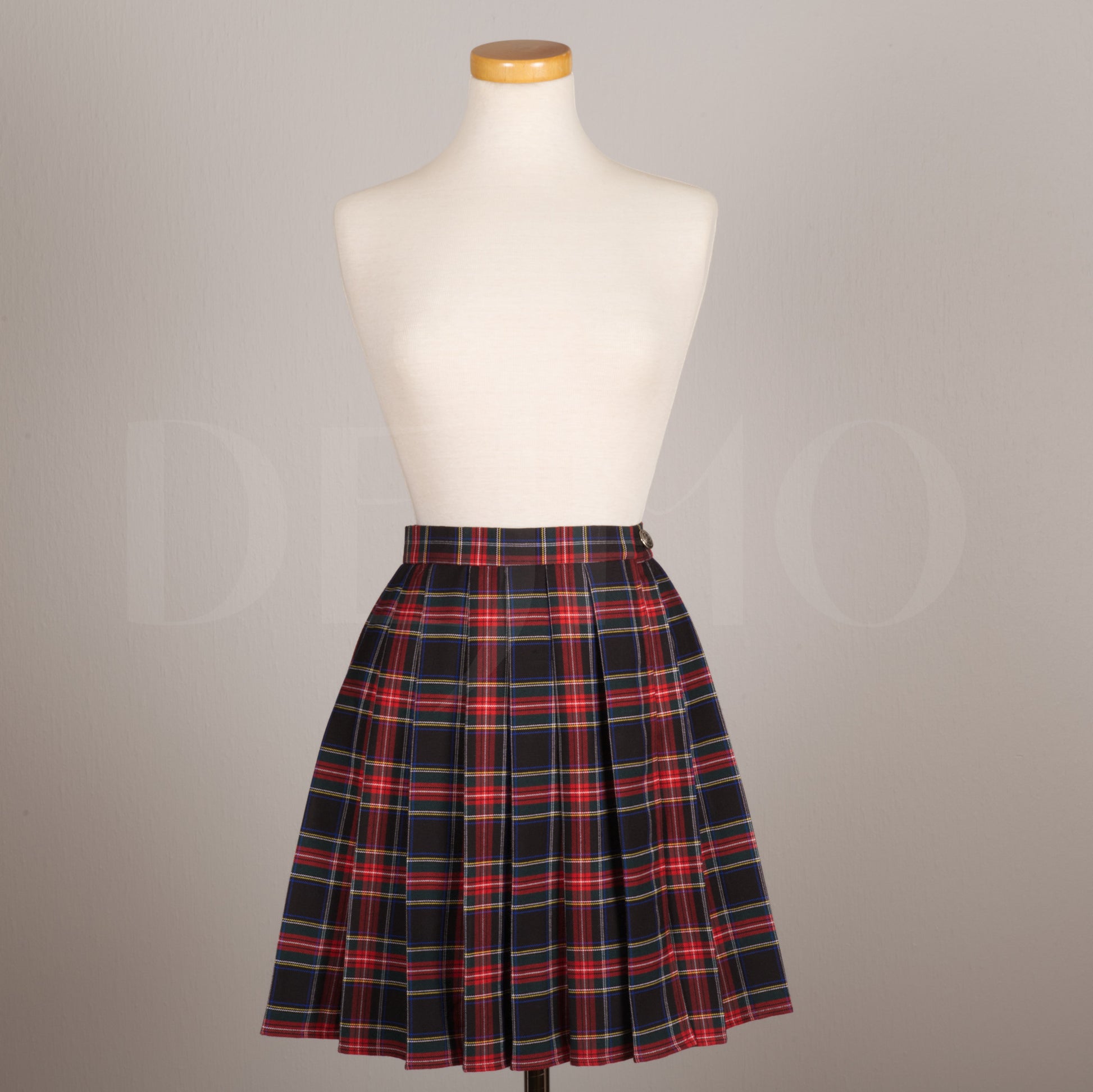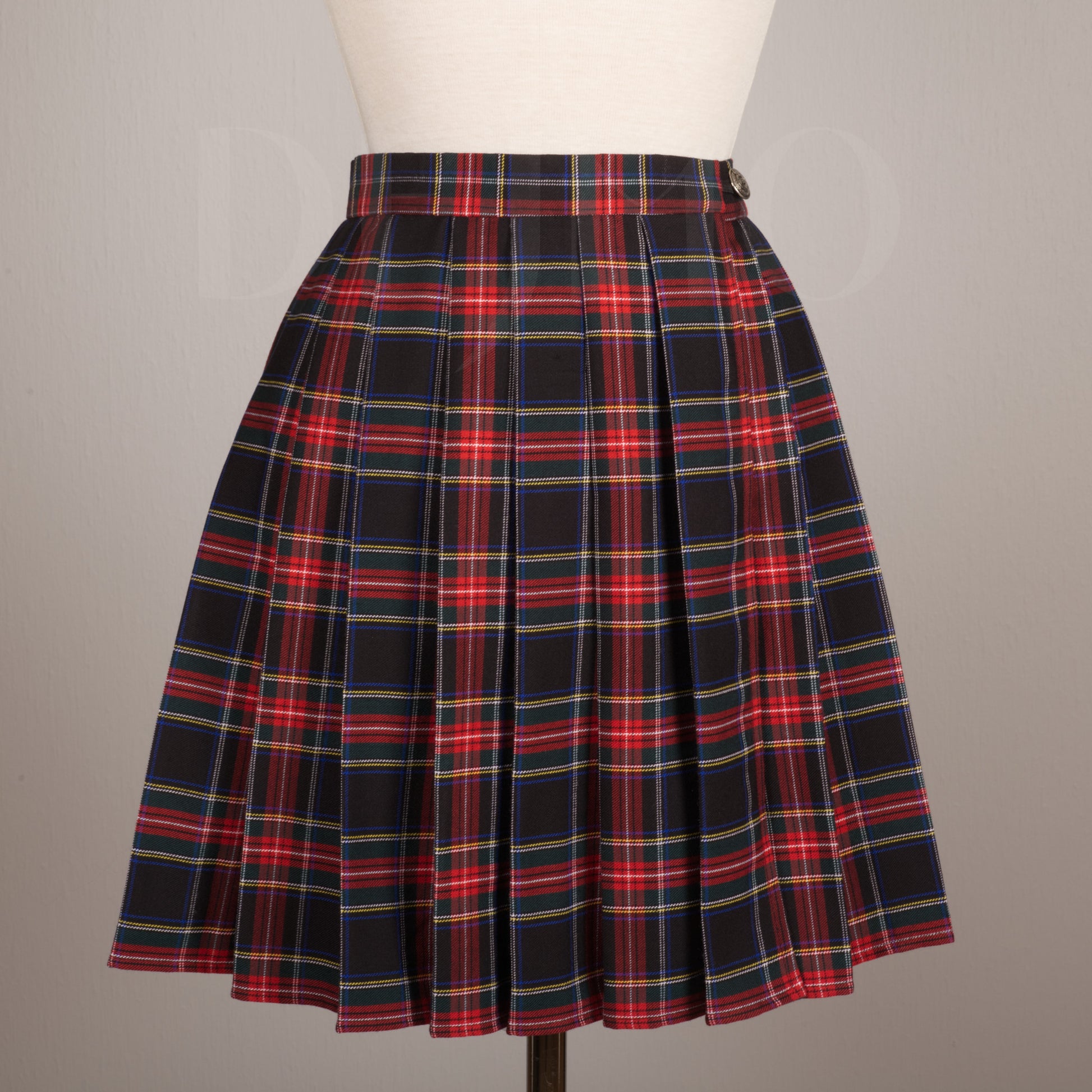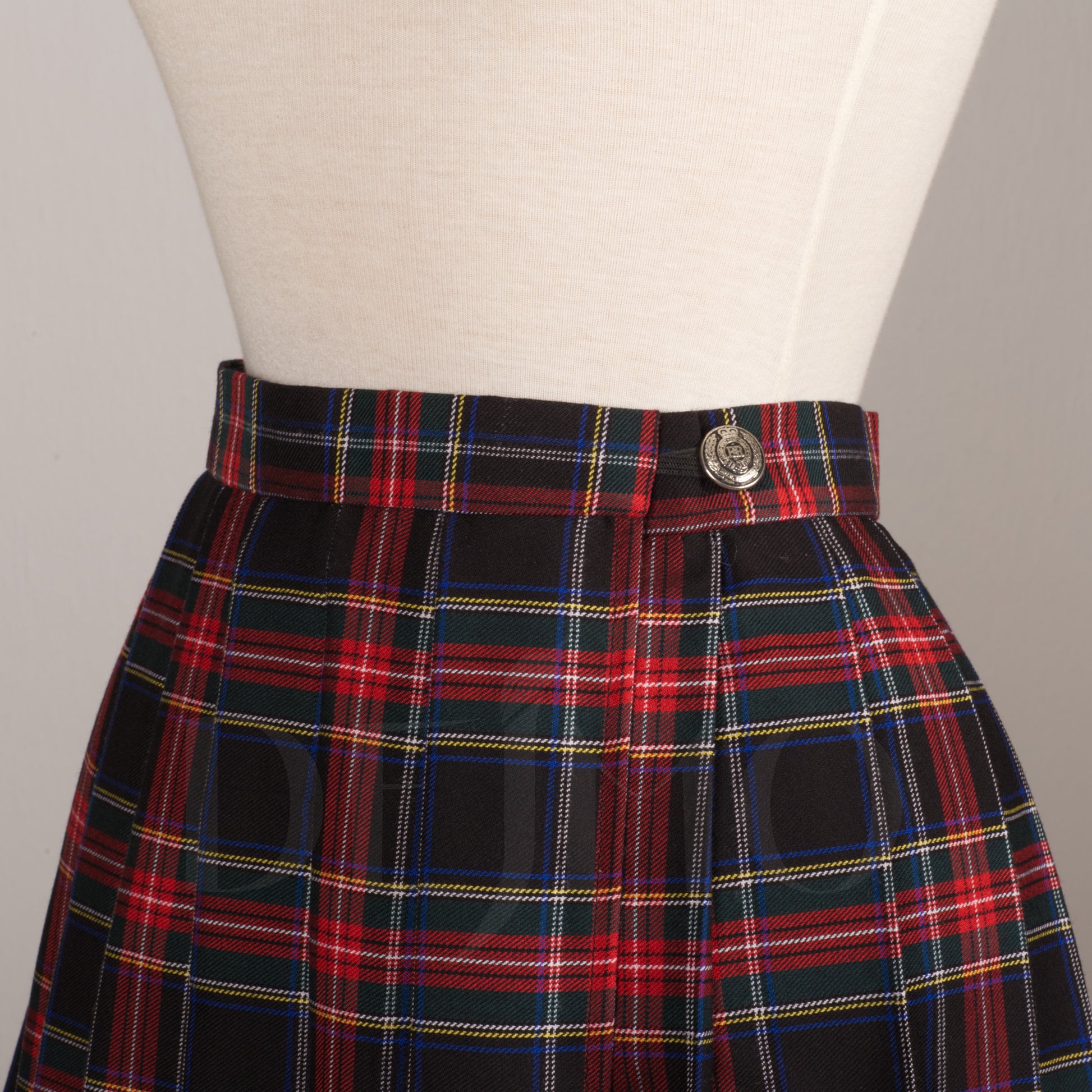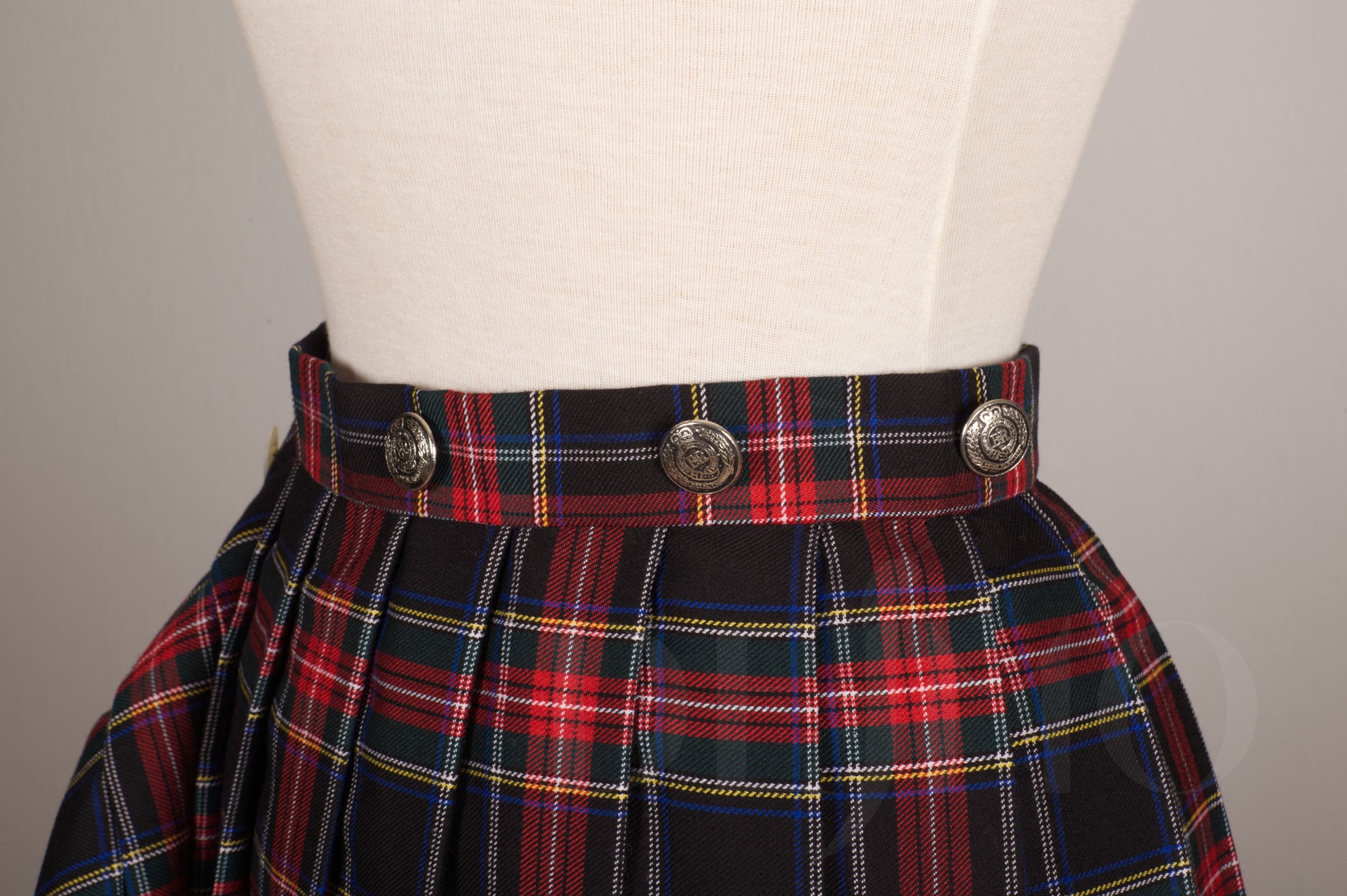 Plaid skirt that closes with buttons at the waist. Metal buttons on the outside and flat vintage mother of pearl buttons for closure on the inside. Size is adjustable to fit three different waist sizes and is slightly elastic for comfort.