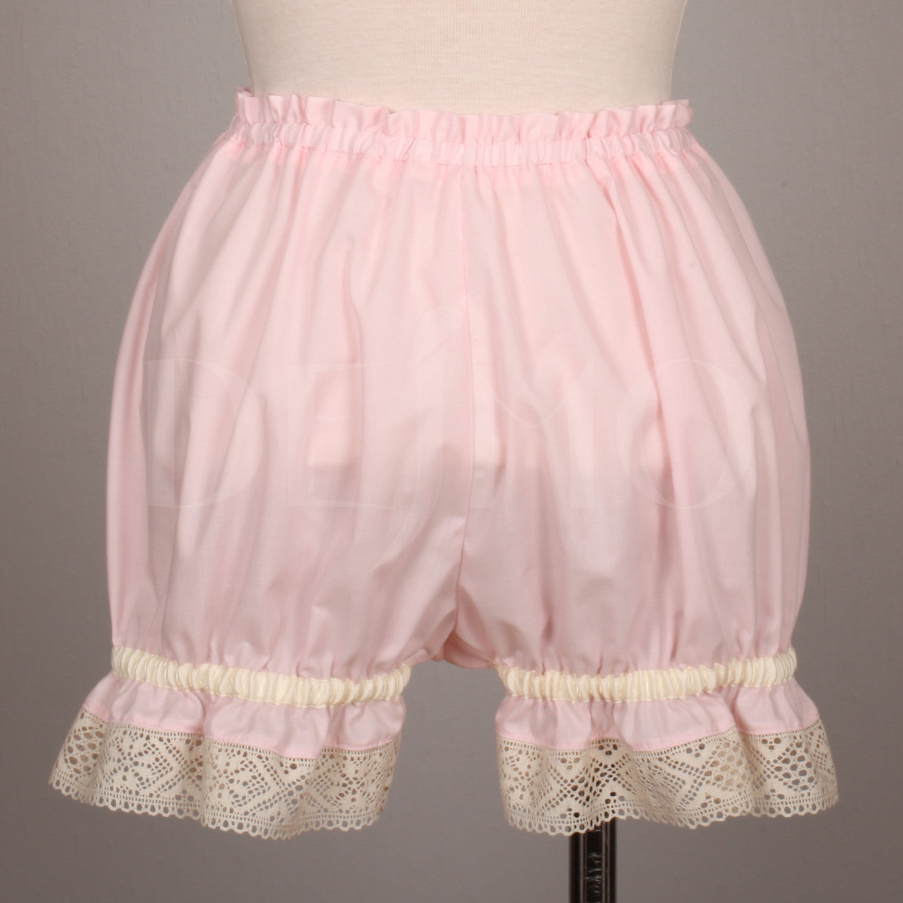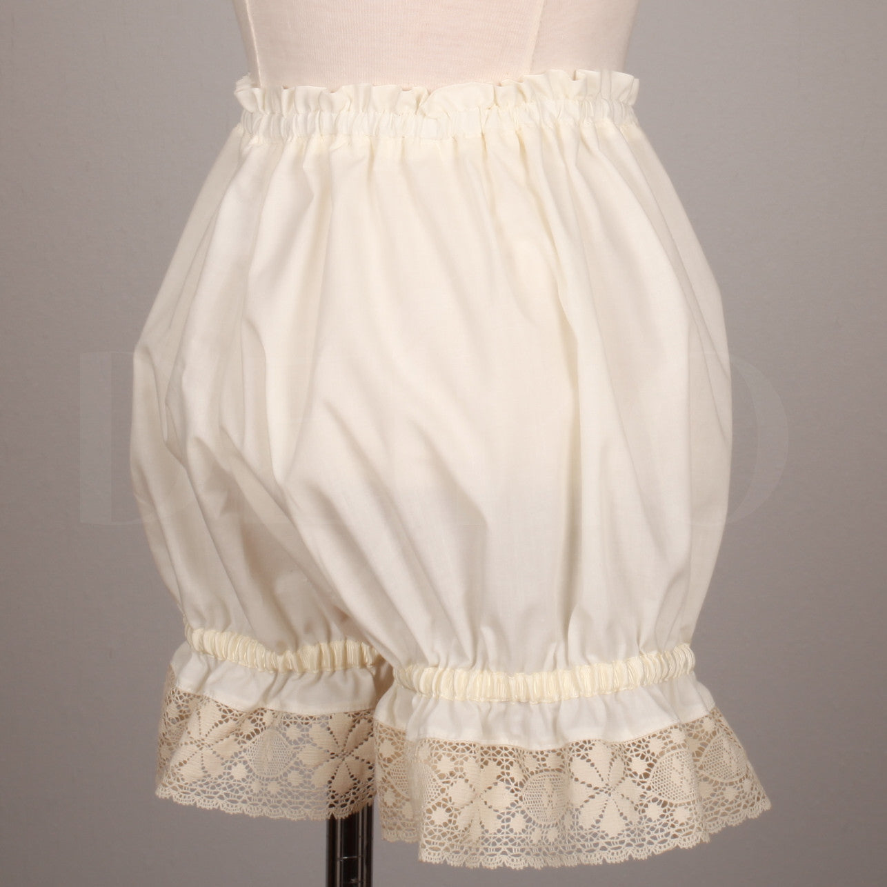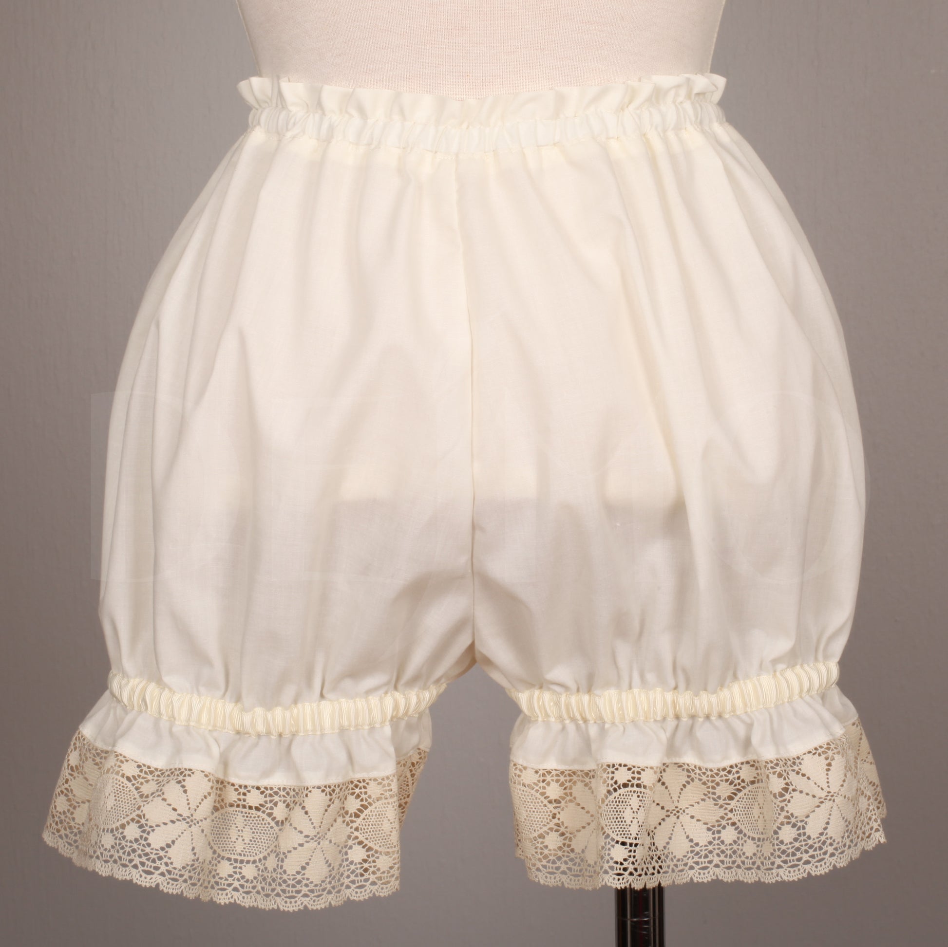 Drawers or bloomers, cute and comfortable. Elastic at the waist and thighs. Made of surplus fabric form our petticoat production and vintage lace.